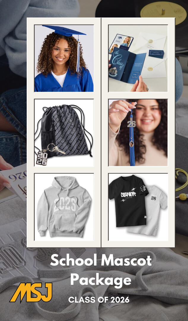 The Mascot Package is the most popular and best value. It includes official announcements, senior apparel/gear, accessories, and a Cap & Gown Unit.